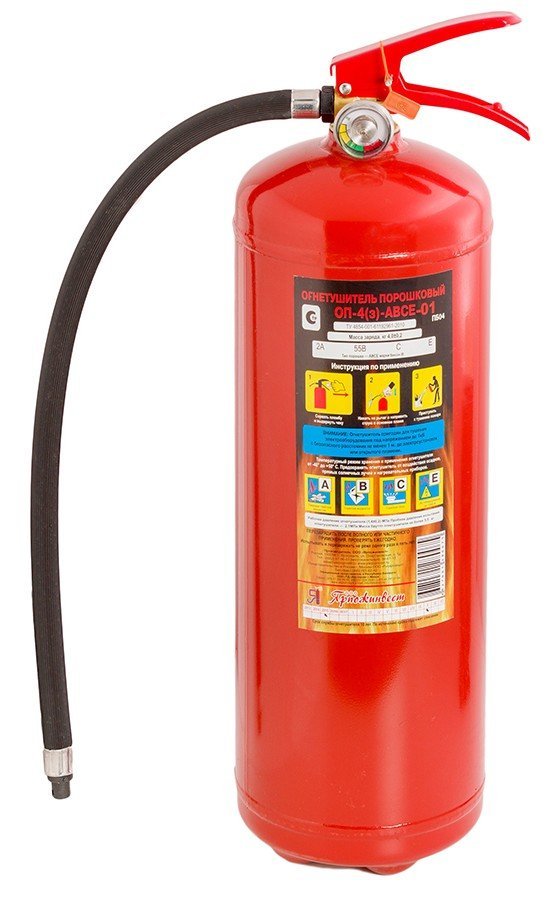 Огнетушитель порошковый закачной, предназначен для тушения пожаров классов А, В, С, Е масса заряда 4 кг, в комплекте шланг без раструба